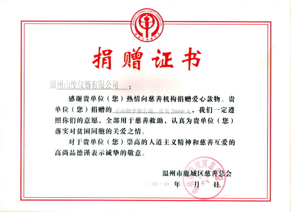 弘揚中華民族重教支教的傳統美德,公司在2008年5月向溫州市鹿城區人民教育基金會捐款人民幣壹拾萬元后。于2010年2月10日在虎年春節來臨之際,續獻愛心,結對貧困學子!向溫州市鹿城區慈善總會定向助學結對捐贈愛心款人民幣貳萬元。