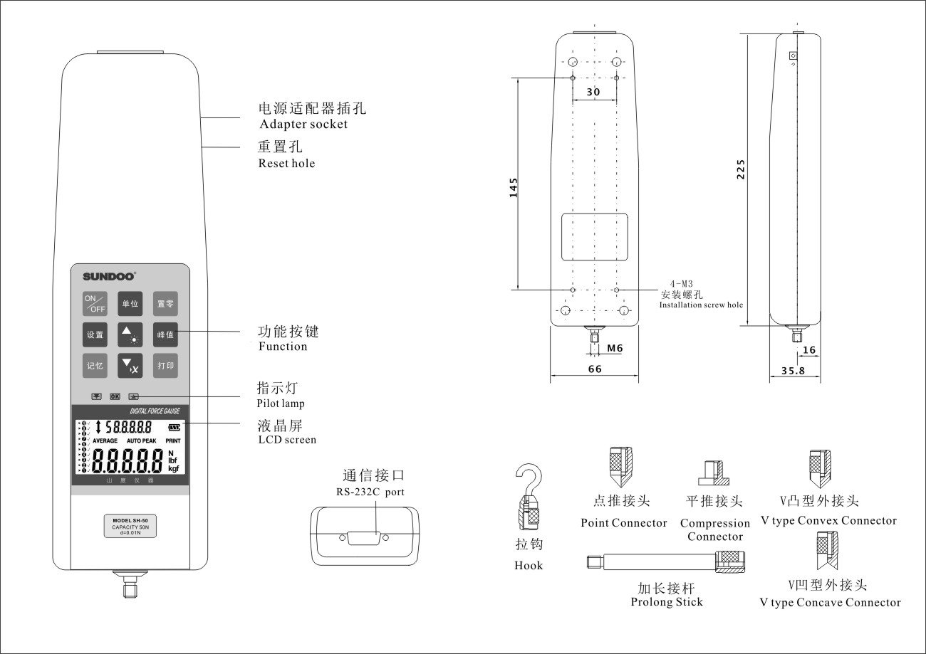 SH系列數顯式推拉力計是小型多功能高精度的推拉負荷測試儀器。適用于各種產品的推拉負荷測試、插拔力測試,破壞試驗等。數字顯示分辨率高,使用方便,為新一代高效高精度的推拉力測試儀器。