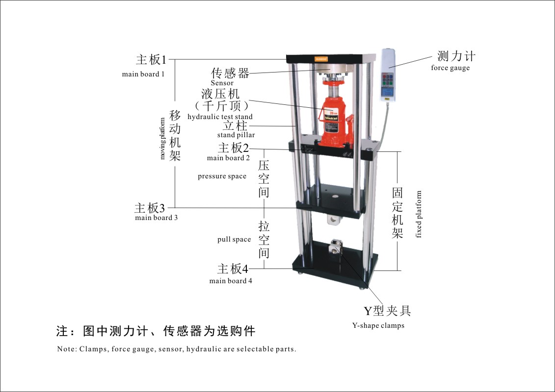 可配置(需另購):SP/SHB(10KN~500KN)數顯式推拉力計、各種推拉測試工裝夾具;
