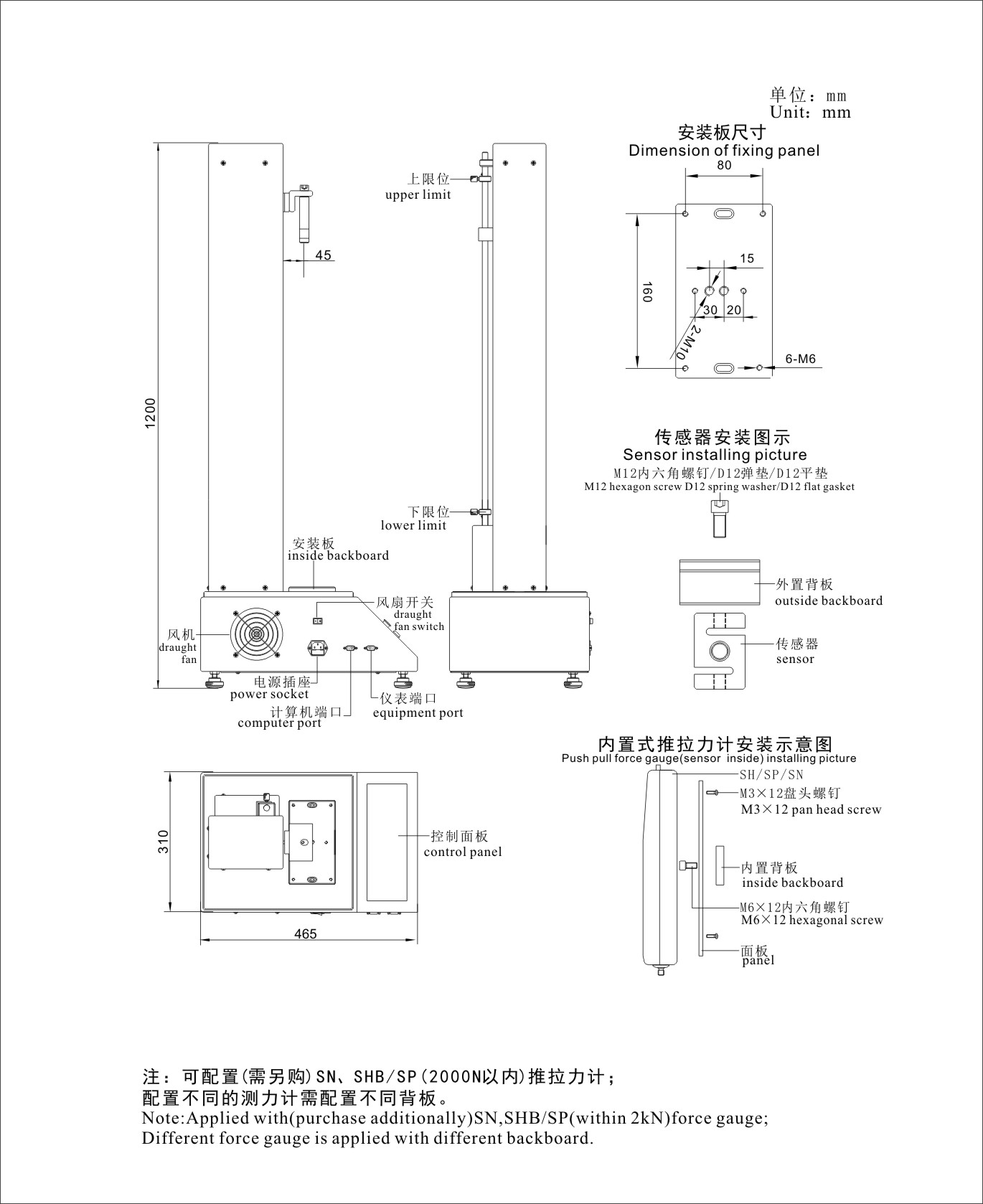 可配置(需另購):SN、SHB/SP(2N-2KN)推拉力計,各種推拉測試工裝夾具。