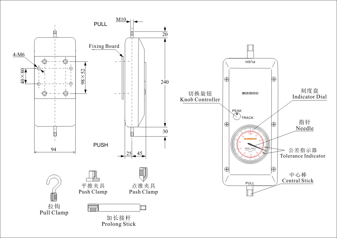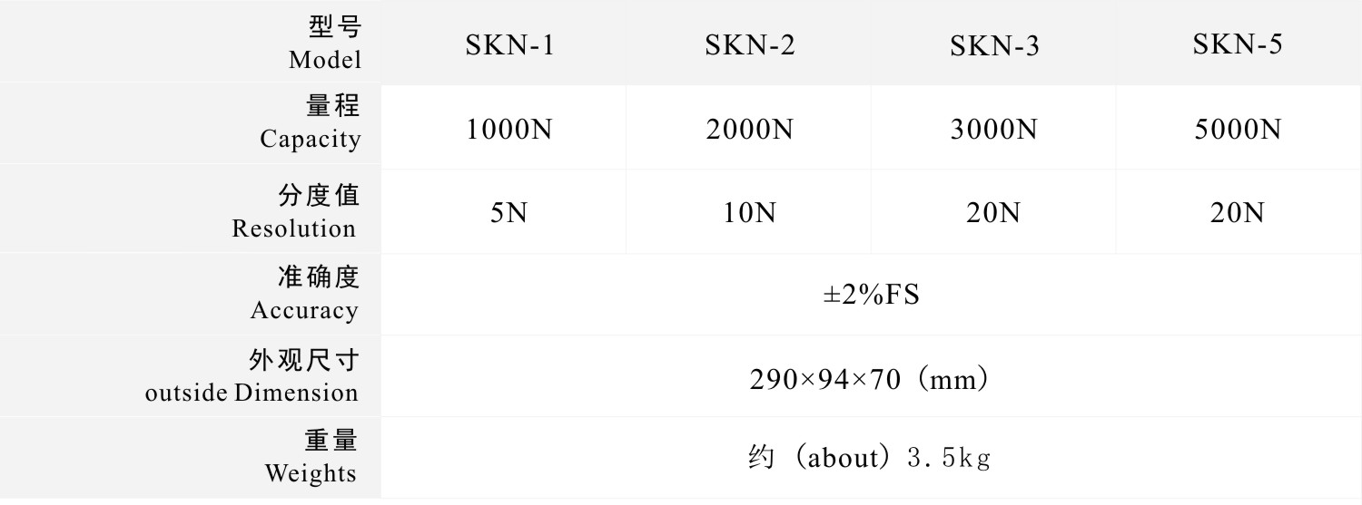 SKN系列推拉力計是小型簡便的推力、拉力測試儀器,具有高精度、易操作及攜帶方便之優點,而且有一個峰值切換操作旋鈕,可做荷重峰值指示及連續荷重值指示。適用于電子電器、輕工紡織、建筑五金、打火機及點火裝置、消防器材、制筆、制鎖、漁具、動力機械、科研機構等行業的推拉負荷測試,是代替管形推拉力計的新一代產品。